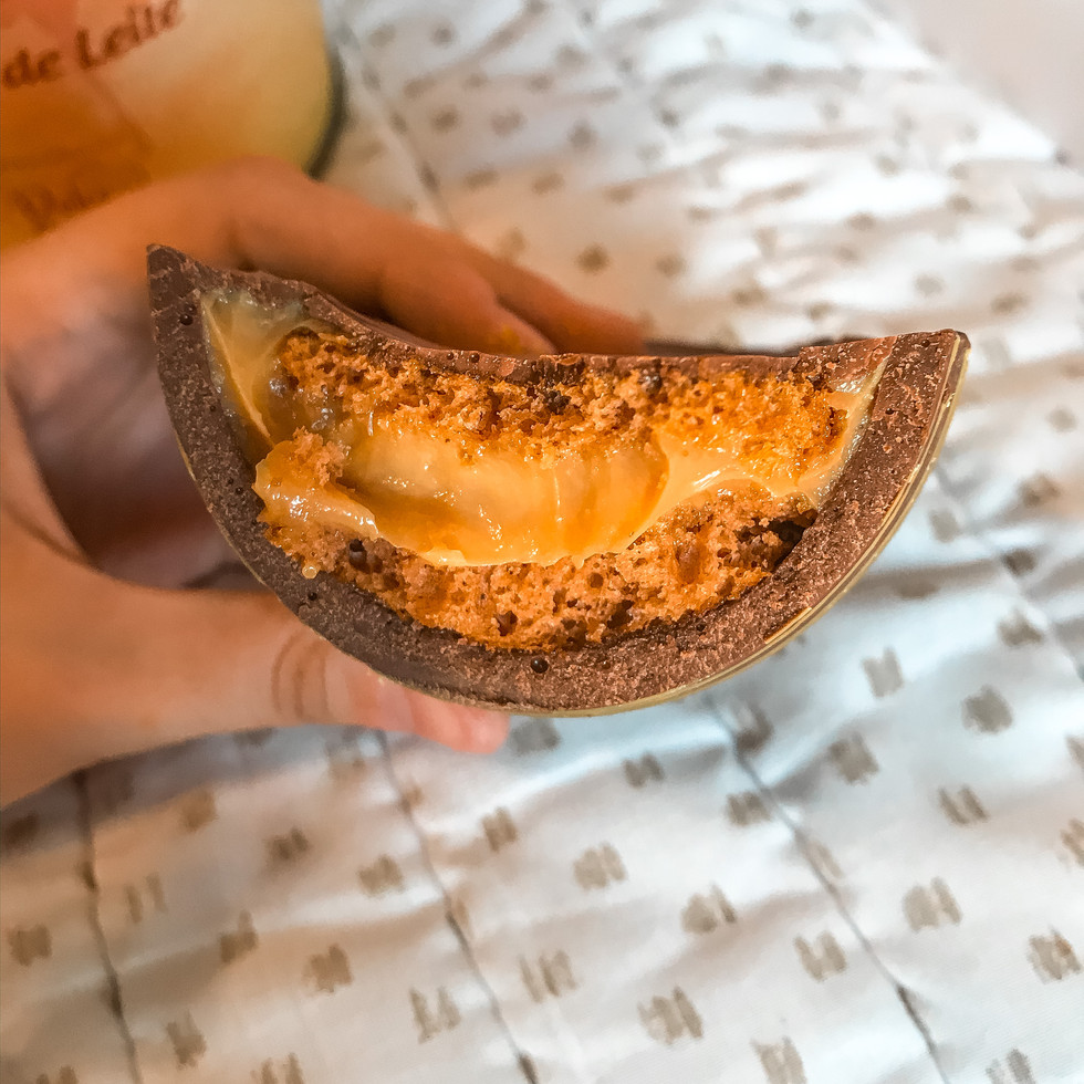 a. Ovo de nhá benta de ninho: esse ovo tem uma apresentação maravilhosa, marca presença. A casca estava ótima e o recheio também estava gostoso, mas achamos um pouco enjoativo, tem que ir comendo aos poucos.