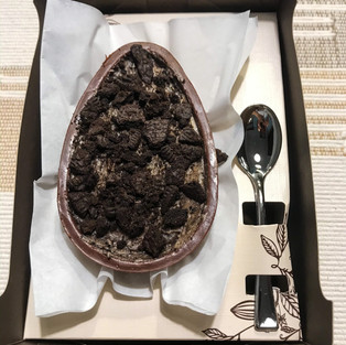 a. Ovo de Oreo com casca de chocolate meio amargo. O ovo estava gostoso, o brigadeiro tinha mais consistência de marshmallow e a casca lembrava a consistência do chocolate Suflair.